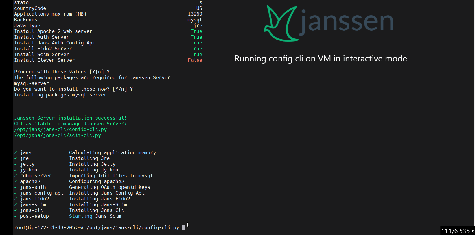 jans-cli module is a command line interface for configuring the Janssen software, providing both interactive and simple single line options for configuration. This module interacts with Janssen server via RESTful configuration APIs that server exposes. Using these REST APIs, jans-cli allows configuration of authorization server and its major modules for FIDO2, SCIM, OpenID Connect etc.